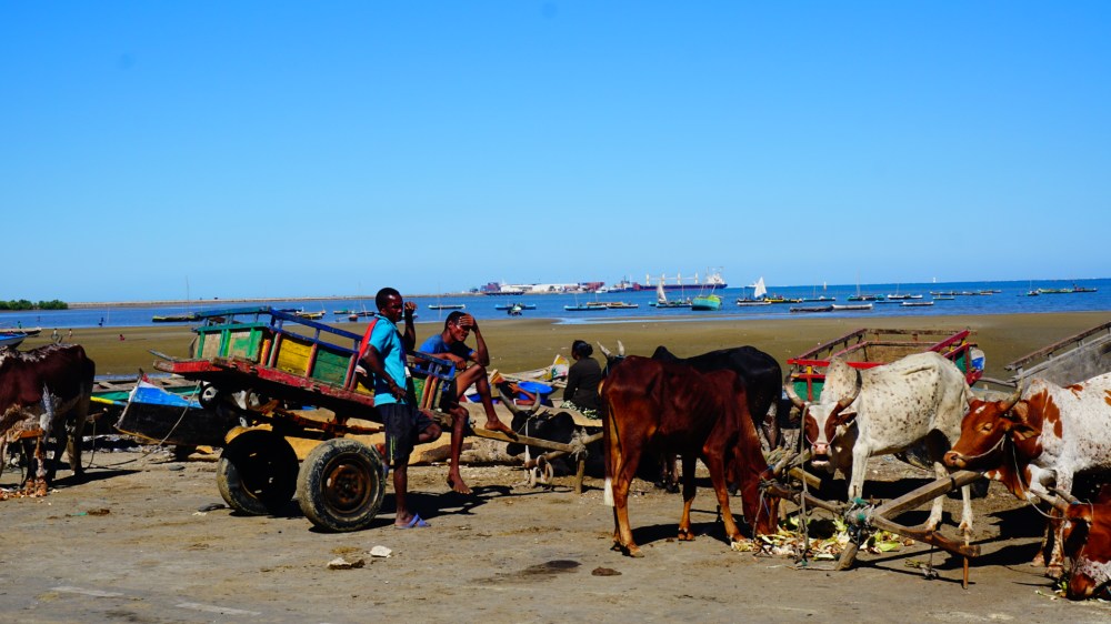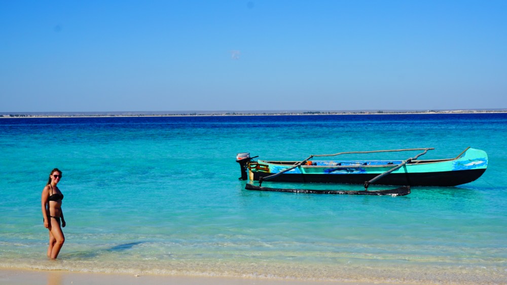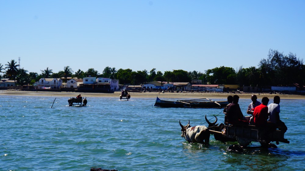 Tuleár heeft alleen een vies bruin strand, dus gaan we de volgende dag met een klein speedbootje naar Anakao, iets meer naar het zuiden. Het ligt gewoon op het vasteland, maar aangezien er geen weg is, kun je er alleen per boot komen. Aanlegsteigers moeten in Madagaskar nog worden uitgevonden, dus gaan we aan boord van een houten kar op 2 wielen, voortgetrokken door twee zebu’s. Arme dieren.. En zo verdwijnen we, in die kar, met onze bagage, een stuk de zee in naar onze speedboot.
