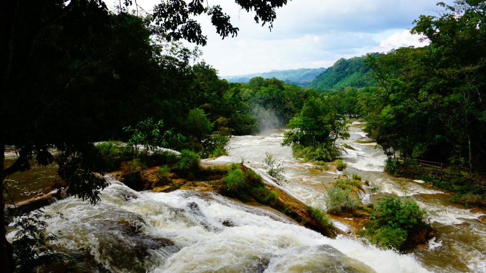 Daarna ga ik mee met een tour. De eerste stop is bij de waterval Misol Ha. Een spectaculaire waterval, waar je ook achterlangs kan lopen. Prachtig! De tweede stop is bij Aqua Azul; trapsgewijze watervallen waar het water intens blauw is. Althans, normaalgesproken. Door de regen is het nu meer Aqua Moreno en is het water dus poepbruin. Jammer.. toch maakt het de waterval niet minder bijzonder. Door het oorverdovende geluid krijg ik een Victoria Falls gevoel.