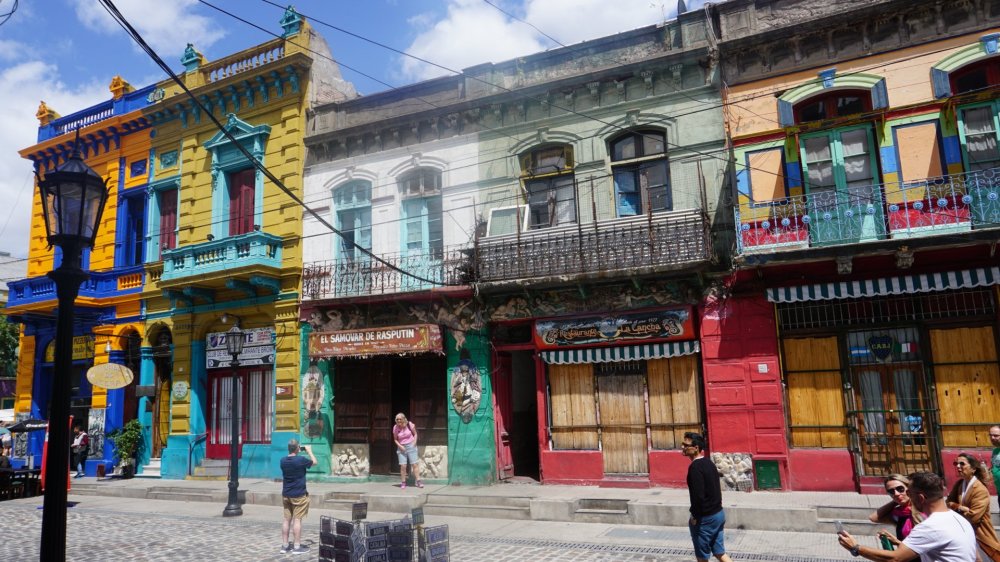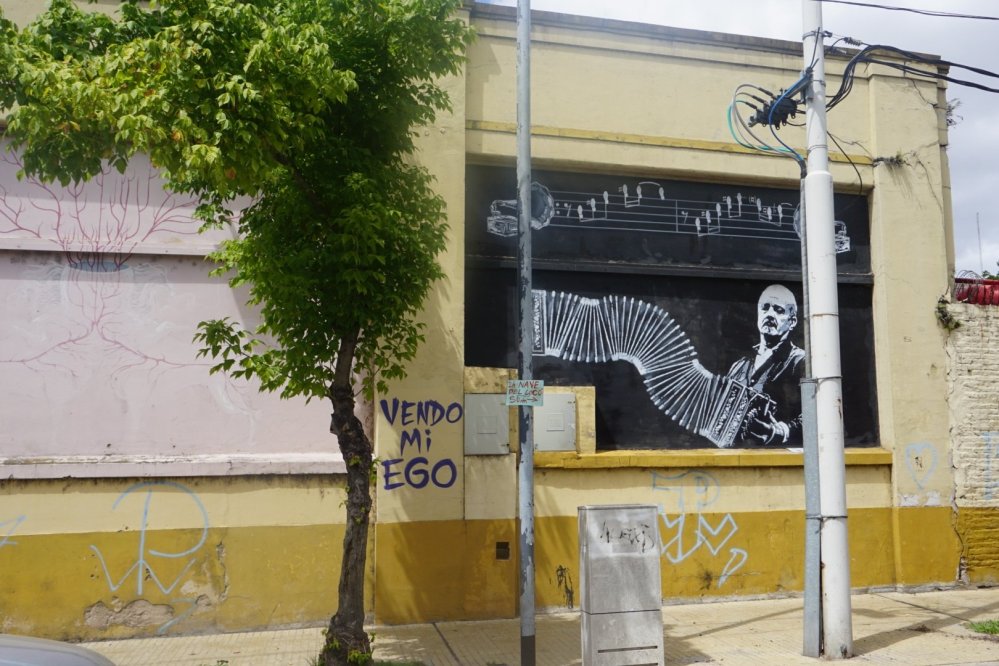 We fietsen verder naar de oudste wijk La Boca. Het was nog net geen sloppenwijk, maar de overheid heeft een paar jaar geleden diverse kunstenaars gevraagd en betaald om de wijk op te leuken met gekleurde huizen en street art. Zo trekt het vanzelf kunstenaars en toeristen en dus stijgen de prijzen. Overdag is het prima, ’s avonds moet je er niet zijn.