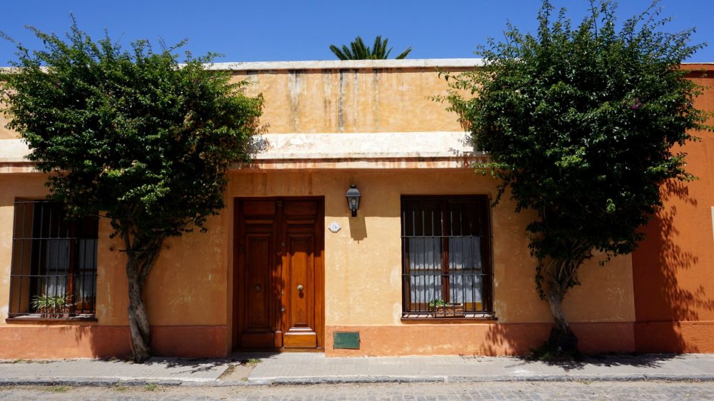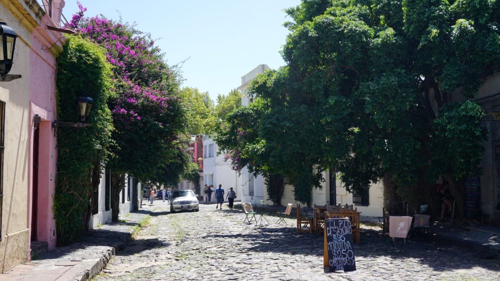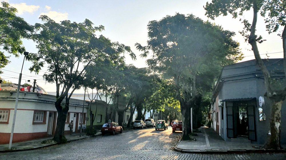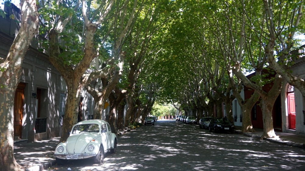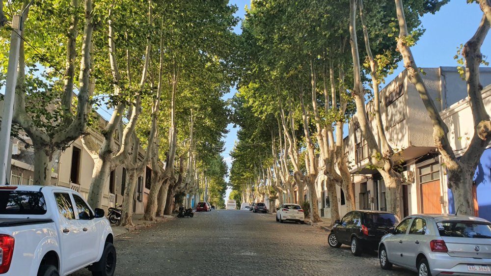 Ik ben in Colonia del Sacramento, een klein stadje aan de kust. Het eerste dat me opvalt is dat alle straten zijn voorzien van rijen bomen, supermooi! Het lijkt wel een sprookjesbos waar ik in wandel, met de zon die door het bladerdak schittert.
