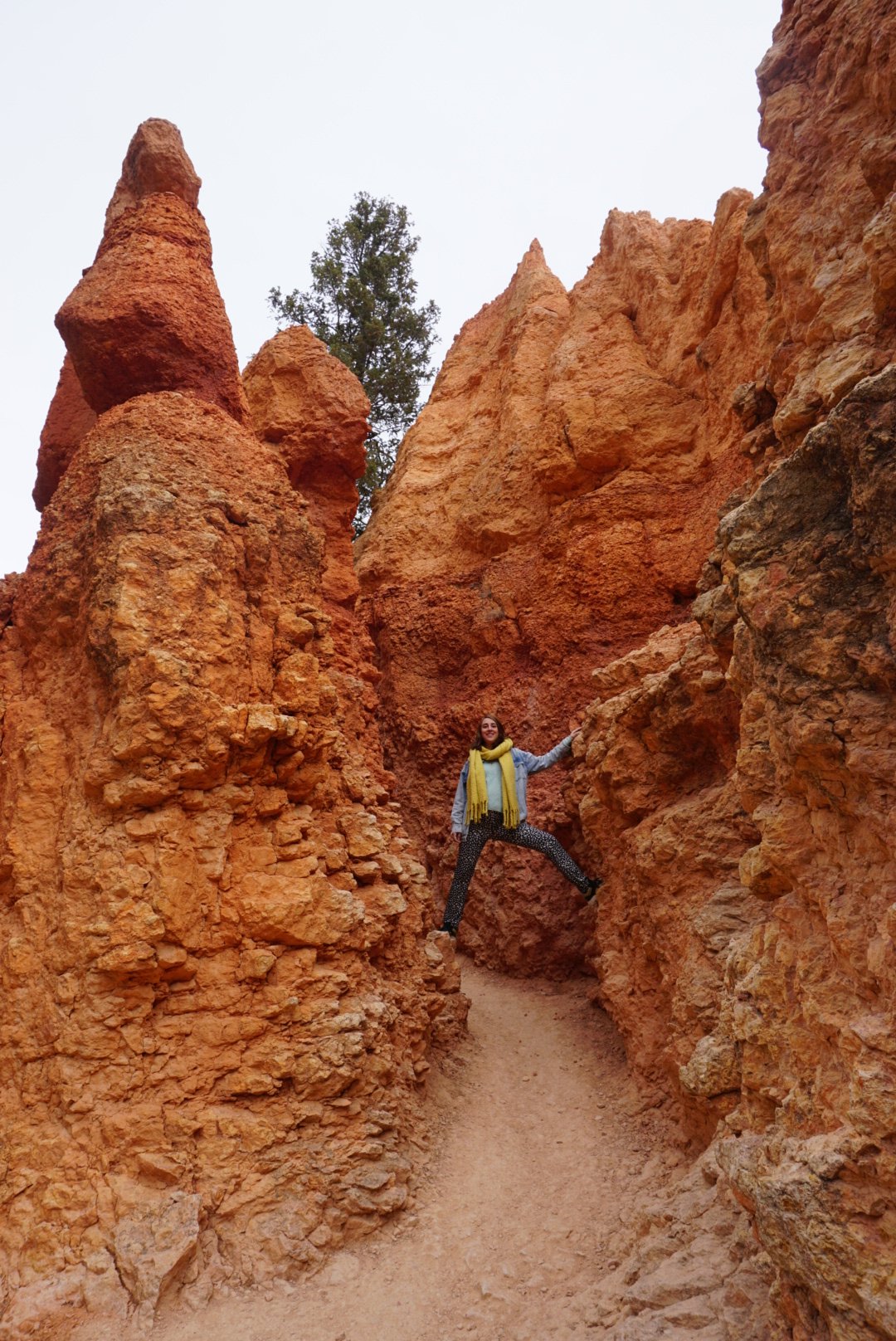 Bij Sunset point besluiten we een hike te doen. De Navajo loop trail en de Queen’s garden trail brengen ons steil naar beneden de canyon in (en shit ja, later moet je dus ook weer omhoog..), dwars door een surrealistisch landschap van oranje en wit zand, groene naaldbomen en stoute mensen. Want men geloofde vroeger dat als je stout was, de coyote’s je veranderden in een hoodoo, een pilaar van wit of oranje steen. Het is echt een van de meest bijzondere landschappen die ik ooit heb gezien, en we vinden het stiekem veel mooier dan de Grand Canyon!