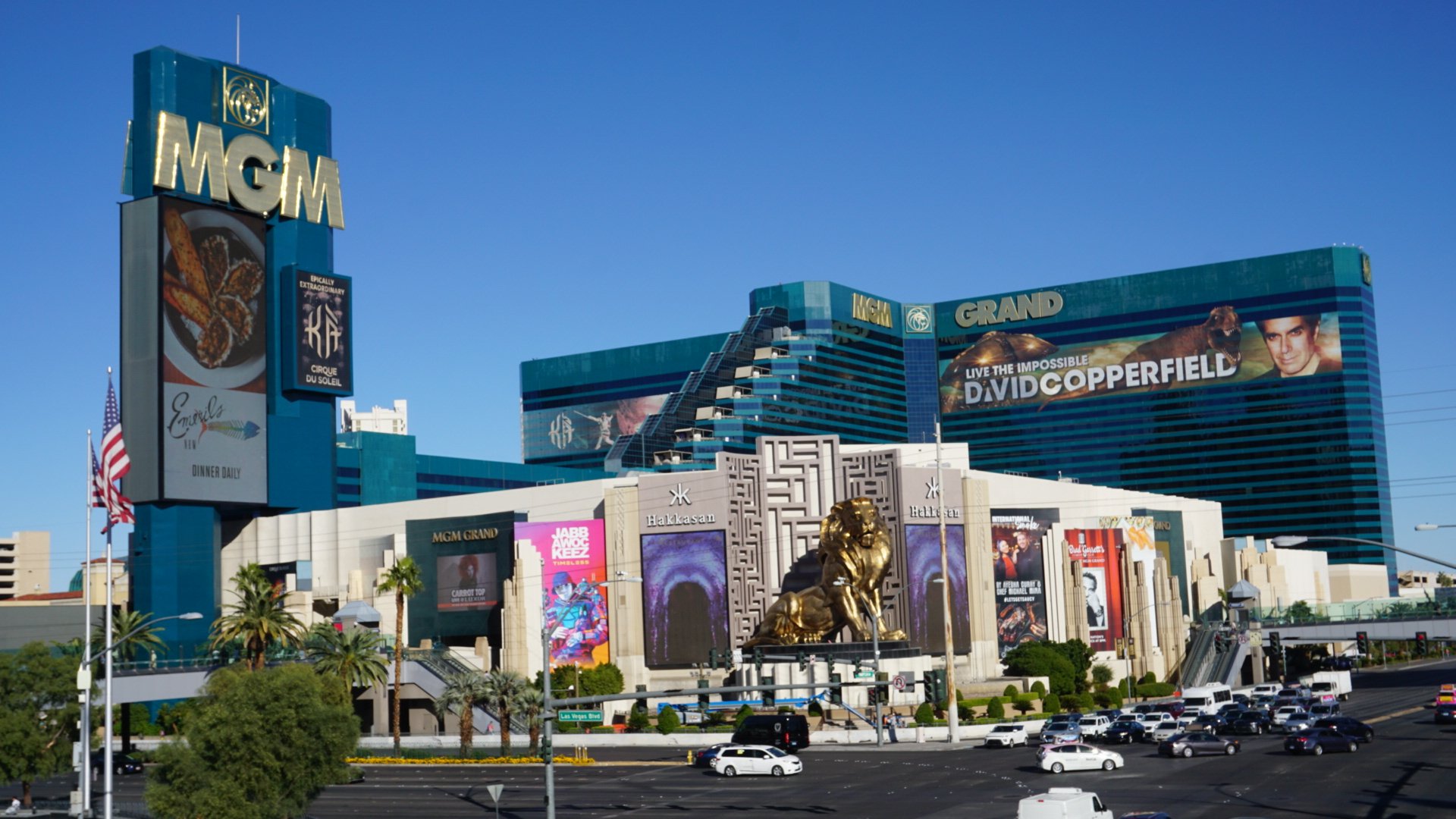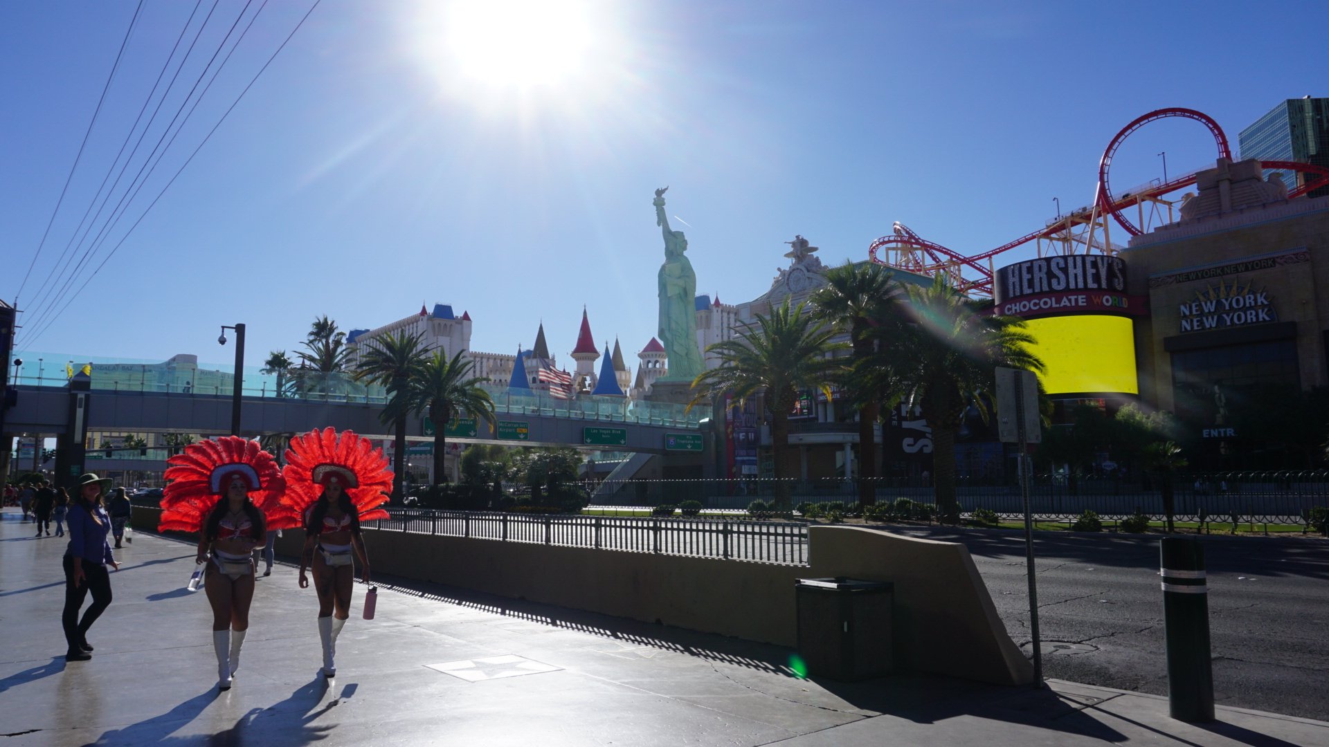 De volgende dag vermaken we ons met een wandeling over de zuidelijke kant van de strip, met om de 100 meter twee paraderende meiden met blote billen en verenpakjes. In de stad waar je met een dollar op zak miljonair kunt worden, is het aannemelijk dat het ook regelmatig andersom gebeurt en zie je net als in elke stad in de VS toch ook veel junkies en daklozen op de stoepen. Een schrijnend contrast met de pracht en praal van alle hotels. Zoals het themahotel New York New York compleet mét vrijheidsbeeld, empire state building, chrysler building en achtbaan. Het Excalibur, dat met zijn fantasy thema meer doet denken aan een sprookjeskasteel uit Disneyland. Het groene MGM grand, dat met zijn ruim 7000 kamers de grootste van Vegas is. Het Mandalay Bay, misschien nog wel het bekendst van de aanslag een paar jaar geleden waarbij een gek uit het raam begon te schieten. Het Luxor, met zijn enorme pyramide, maar dat helemaal aan het eind van de strip zit en er daardoor nogal zielig en verlaten bij staat.