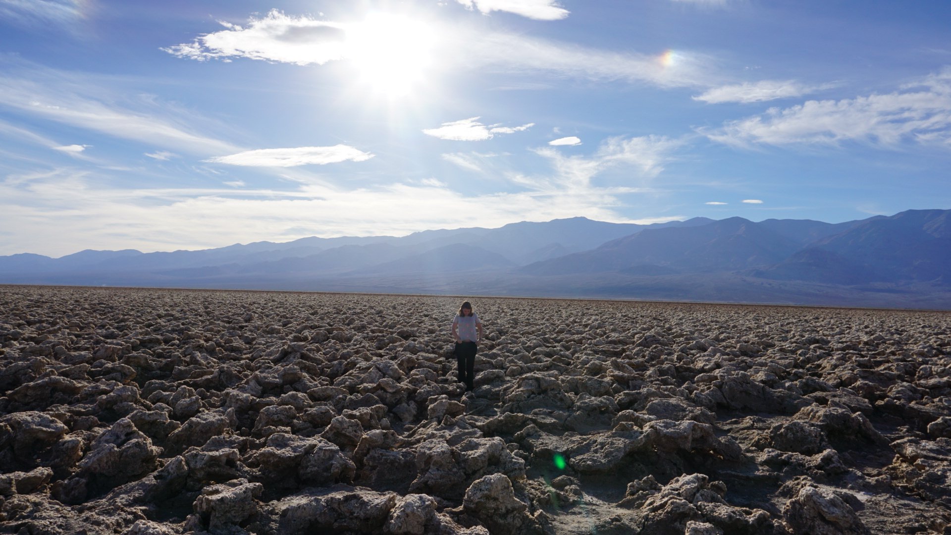 Een stuk verderop bij Devil’s golf course is het landschap vooral plat wat eruit ziet als opgedroogde gescheurde modder, maar bestaat uit scherpe, uitsteeksels van zout. Daar wil je niet op vallen!