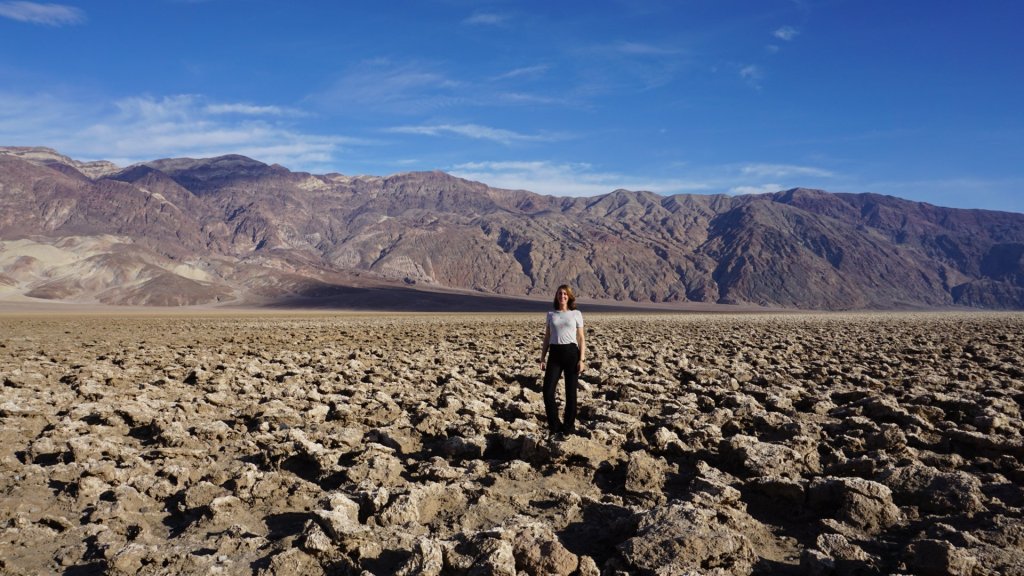 Weer iets verderop bij Badwater Basin veranderen de bruine vlakken in witte zoutvlaktes, wat meer doet denken aan Salar de Uyuni in Bolivia. Het wordt hier in de zomer makkelijk 50 graden, maar gelukkig tikken wij er ‘slechts’ net de 30 aan waardoor we er even rond kunnen lopen. Want met het idee dat dit met ca -80 meter onder zeeniveau het laagste punt is van heel Noord-Amerika, is dat toch best bijzonder.