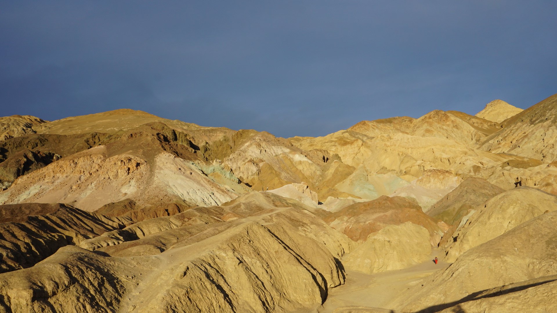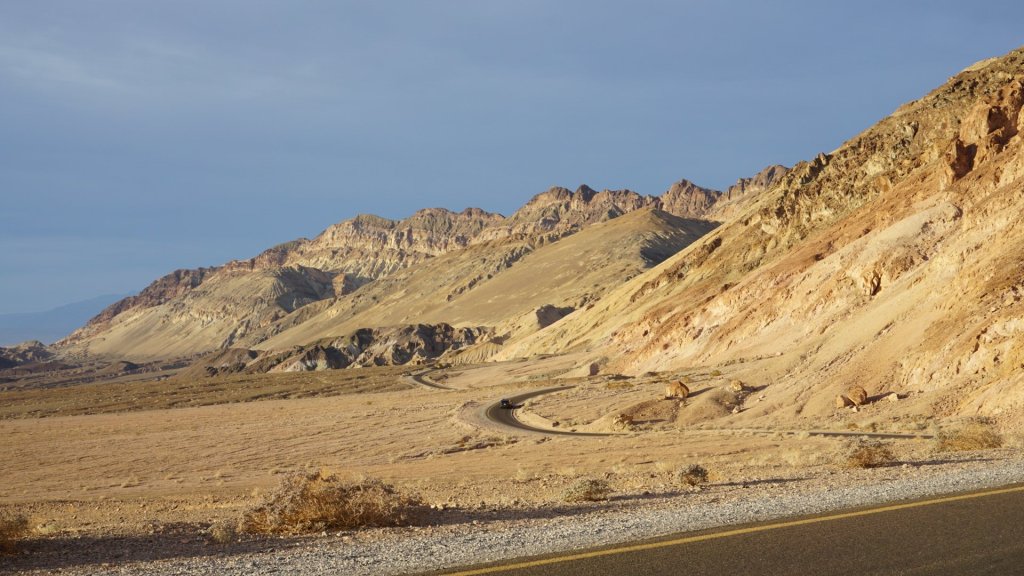 Daarna rijden we de Artist Drive route, een mooi ritje door de gele en beige bergen met bij het Artist Palette punt uitzicht op roze, mintgroen en andere pastelkleuren in de rotsen.