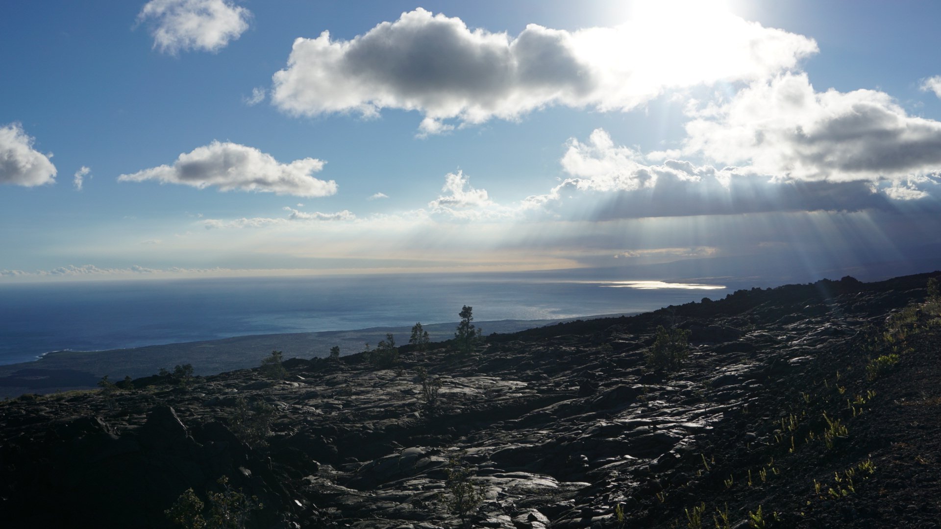 Daarna rijden we de weg af naar het zuiden naar de kust. Een eindeloze weg door de uitlopers van gestolde lava van uitbarstingen in de jaren ’70, ’80 en recenter. Bijzonder om te zien hoe de lavastromen zo de oceaan in liepen. Tijdens de rit worden we door de regen op zee ook nog getrakteerd op een mooie regenboog!
