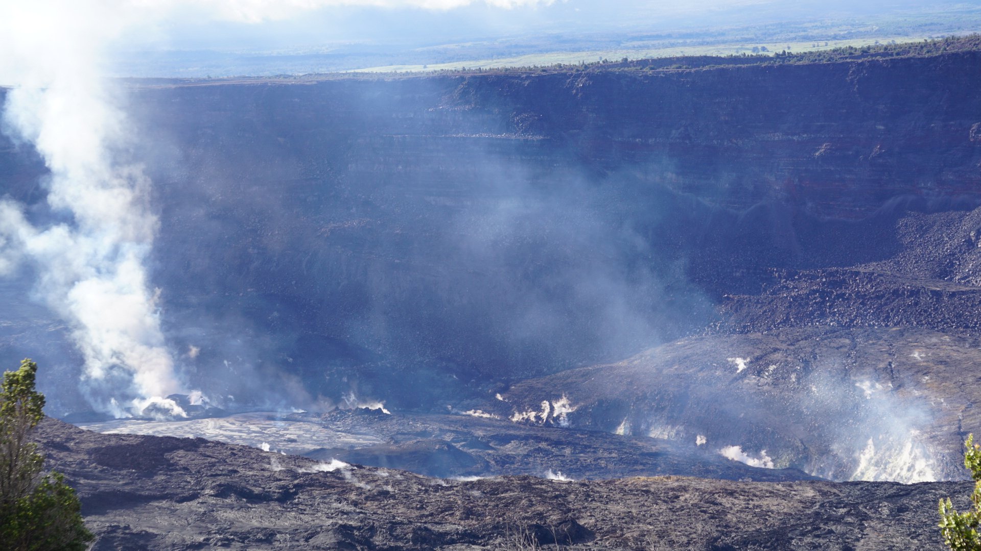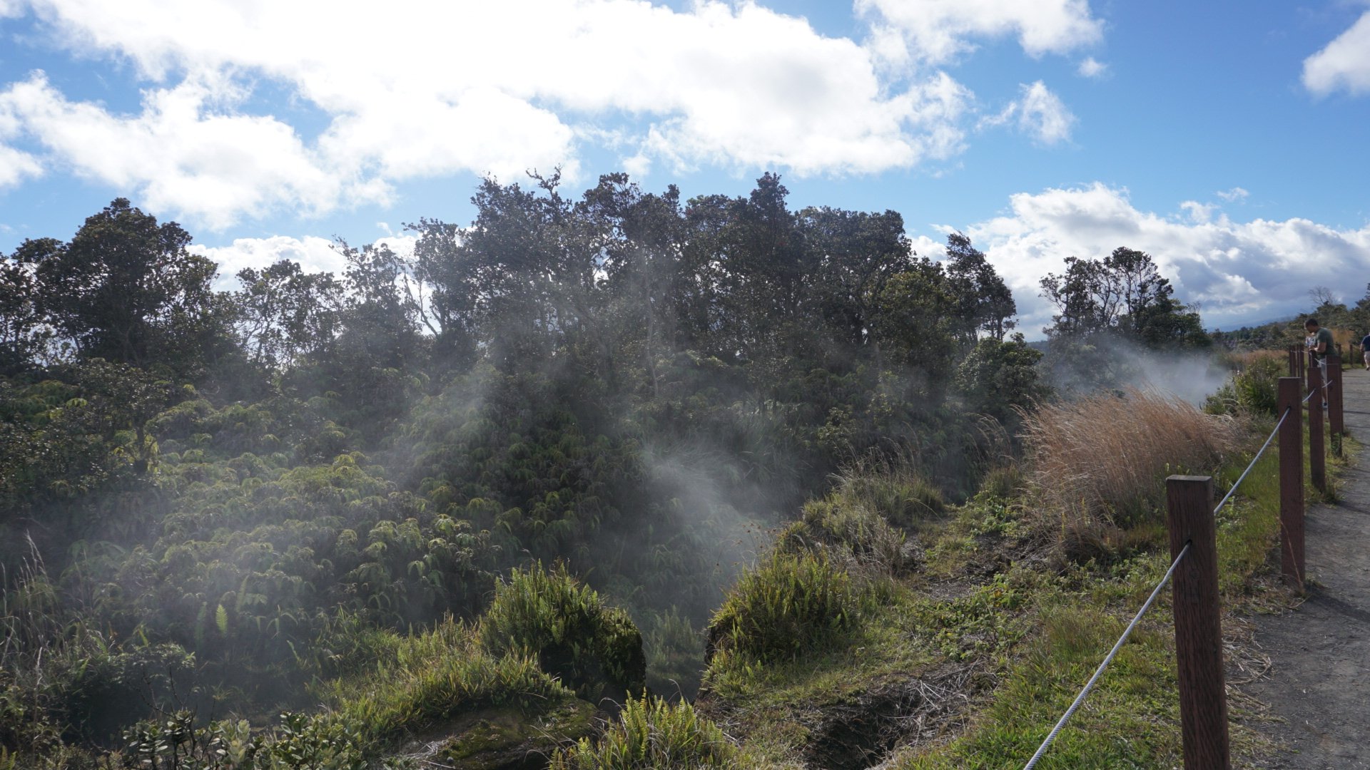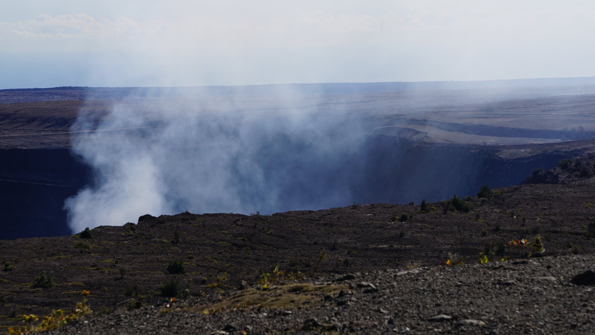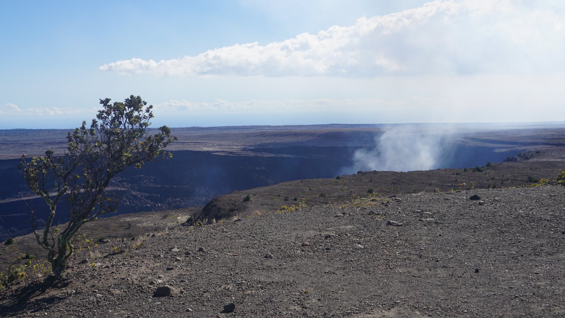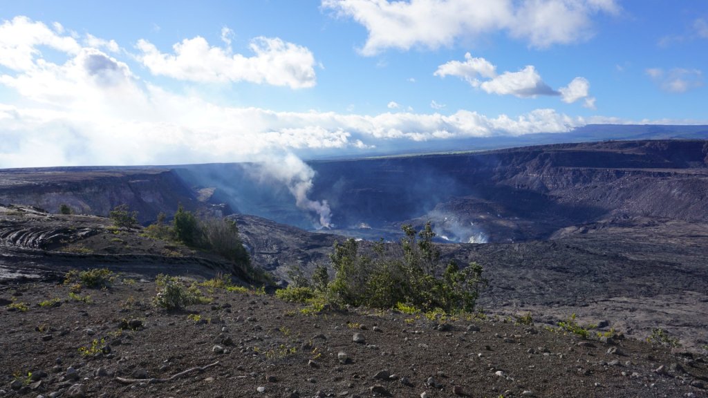 De volgende dag is het zonnig dus besluiten we de dag te besteden in dat waar we voor gekomen zijn: het Volcanoes NP. We rijden de crater rim drive af langs de krater van de vulkaan Kilauea, waar we bij de lookout een eerste zicht hebben op de enorme Halemaumau krater, waar de stoom als een enorme witte wolk bovenuit komt.