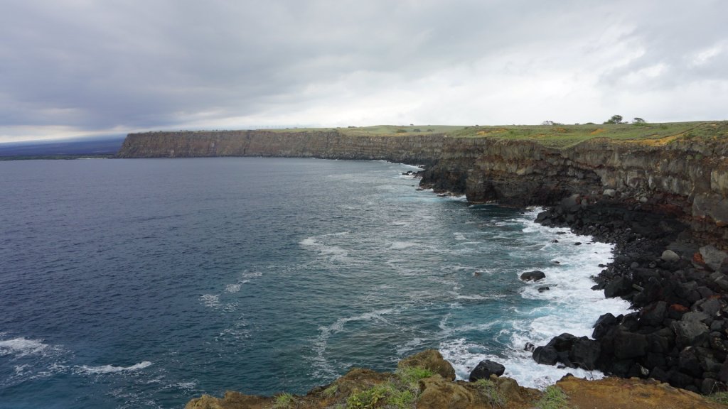 Omdat in Kona de goedkoopste slaapoptie 300 dollar per nacht kost, kiezen we voor de andere stad op het eiland aan de oostkust, Hilo. Maar zoals de naam van het eiland al doet vermoeden, is Big Island groot, en ligt Hilo aan de andere kant van het eiland op een kleine twee uur rijden. We besluiten er in ons schattige Chevrolet Sparkje via de zuidkust heen te crossen, zodat we onderweg nog wat strandjes mee kunnen pakken. Maar vanwege de vulkanische aard van het eiland, zijn die er nauwelijks en is het vooral één lange rotskustlijn. Niet erg, want het gaat regenen dus strand zit er vandaag toch niet in. We rijden door naar het meest zuidelijke punt, South Point, wat ze beter het meest deprimerende punt van het eiland hadden kunnen noemen. Op een zonnige dag is het vast heel mooi, maar met de grijze wolken, witte zee, en zwarte rotsen die wij zien, zou je bijna denken dat je camera kapot is en alleen nog zwartwitfoto’s maakt. Als het even droog is, verschijnt er wat kleur, maar past het uitzicht op de kustlijn meer in een reismagazine over Schotland dan over Hawaii. Weer even een reality check: zijn we echt op Hawaii? Dit eiland was toch het échte Hawaii?! Blijkbaar nog steeds niet zoals wij het ons voorgesteld hadden..